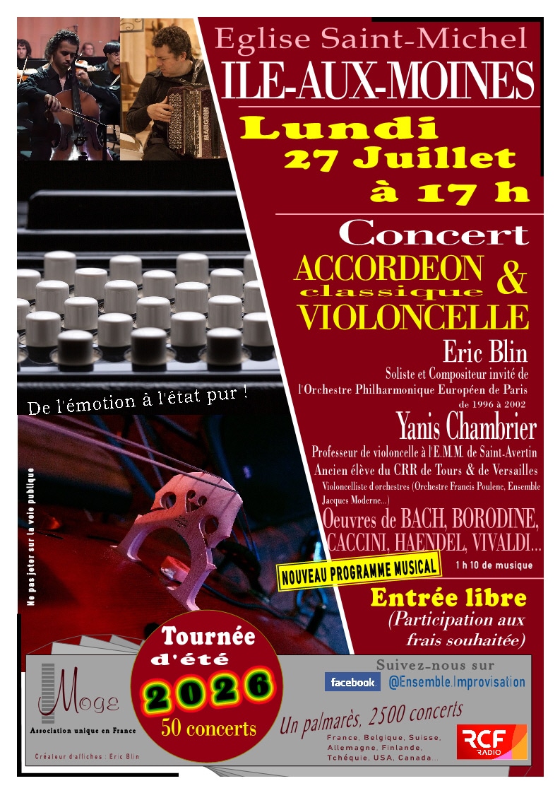 À l’affiche, un duo singulier formé par Yanis Chambrier, musicien d’orchestres symphoniques au violoncelle, et Éric Blin, compositeur de musique de film, soliste et compositeur invité de l’Orchestre Philharmonique Européen de Paris, à l’accordéon classique. Ensemble, ils proposent un programme riche et accessible, réunissant de grandes œuvres du répertoire européen : Vivaldi, Haendel, Borodine, Dvořák et d’autres compositeurs majeurs.