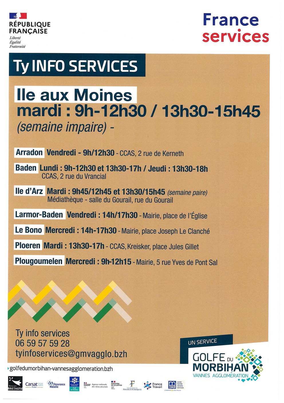 Située sur les 8 communes de l’ouest de Vannes, Ty info services labellisée France services offre dans un même lieu un ensemble de services de proximité. Elle propose un accompagnement dans les démarches de la vie quotidienne. Elle accueille, conseille les usagers et les professionnels dans leurs démarches et les oriente vers les partenaires adaptés.